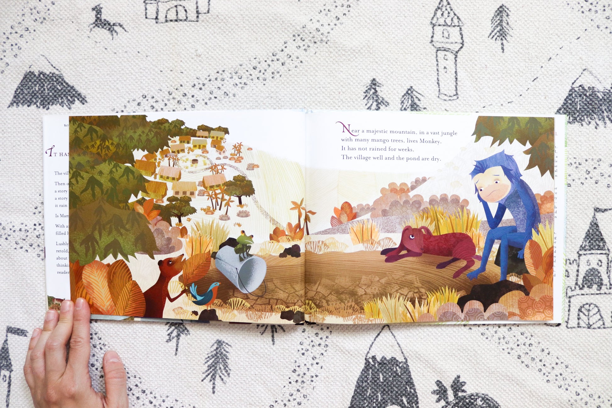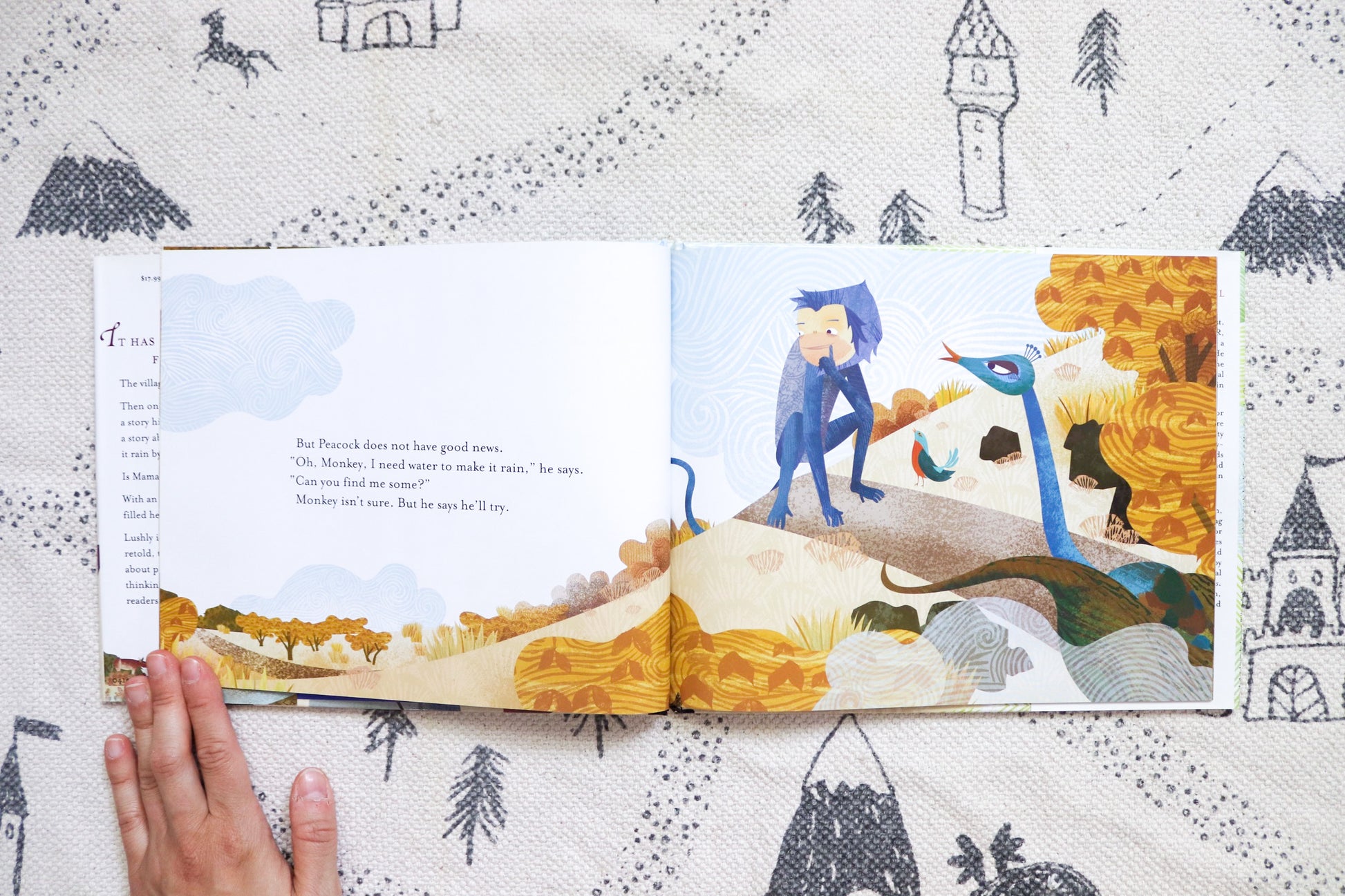 Near a majestic mountain in a vast jungle with many mango trees, it has not rained for weeks and weeks. The village well and pond are dry. Monkey and his friends look everywhere for water, but they have no luck. And then Monkey remembers a story his mama used to tell him, a story about how peacocks can make it rain by dancing. So he sets out to see if the story is true…