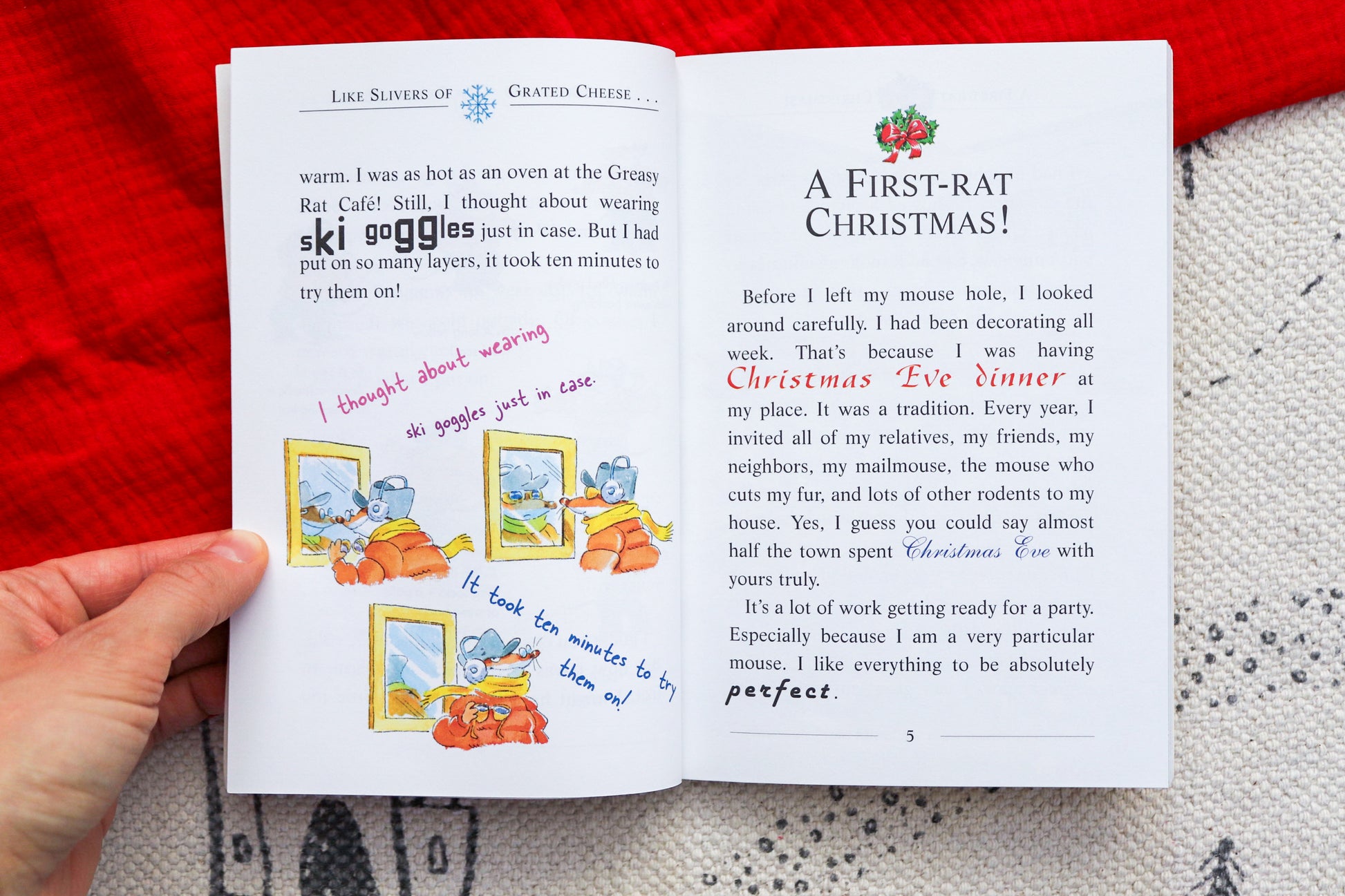 Enter the world of Geronimo Stilton, where another funny adventure is always right around the corner. Each book is a fast-paced adventure with lively art and a unique format kids 7-10 will love.I was so excited about Christmas, I could squeak! My favorite nephew Benjamin was going to come over, and we were planning to trim the tree and eat lots of delicious holiday Cheesy Chews. But before you could say "cat alert," disaster struck! I slipped over my tail and ended up in the hospital. And then my mouse hole caught on fire! Holey cheese, this was turning out to be the worst Christmas ever....