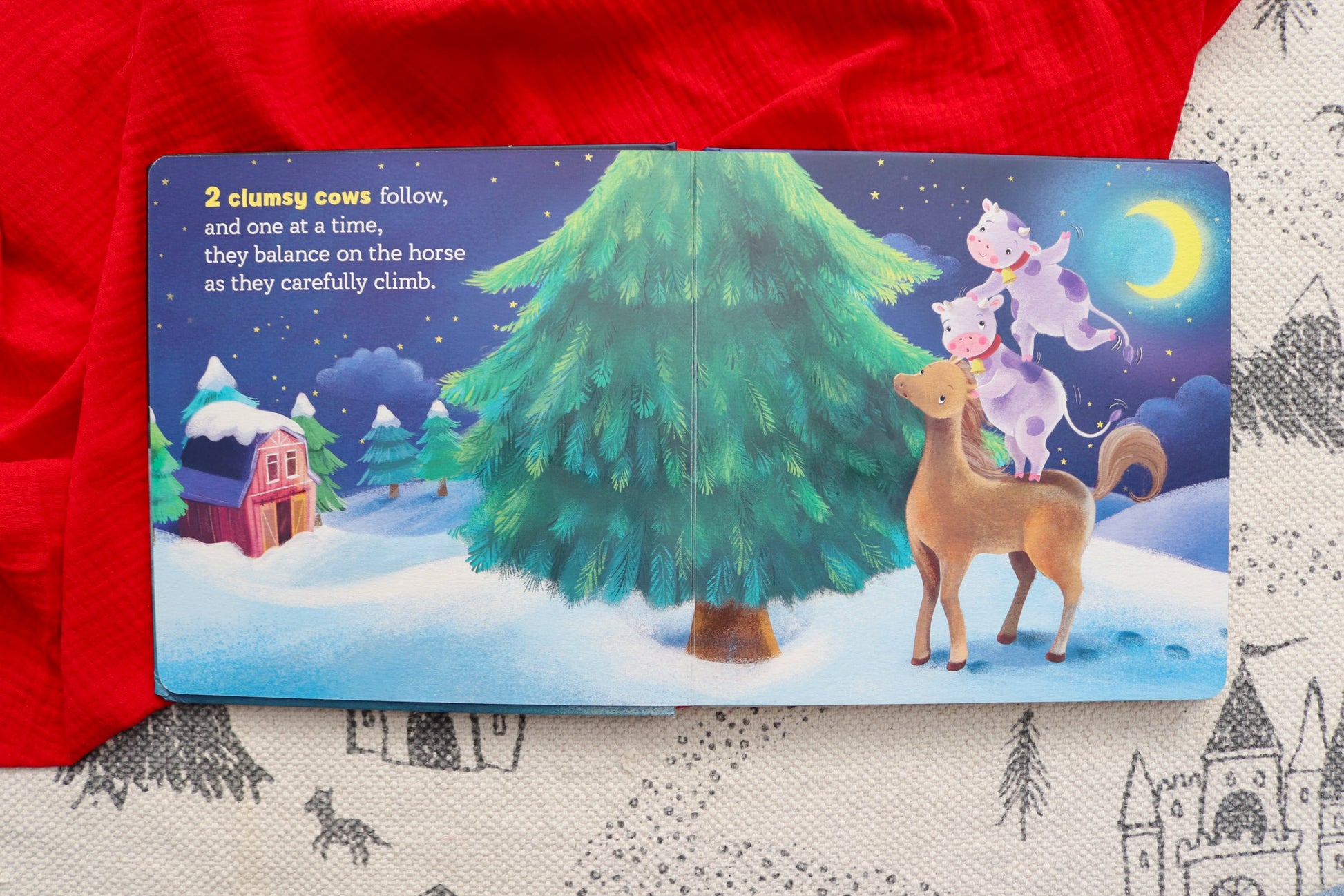 It’s Christmas Eve at the farm, and all the barnyard animals are taking turns sneaking out of the barn. At the old pine tree, they make an animal ladder. But why?