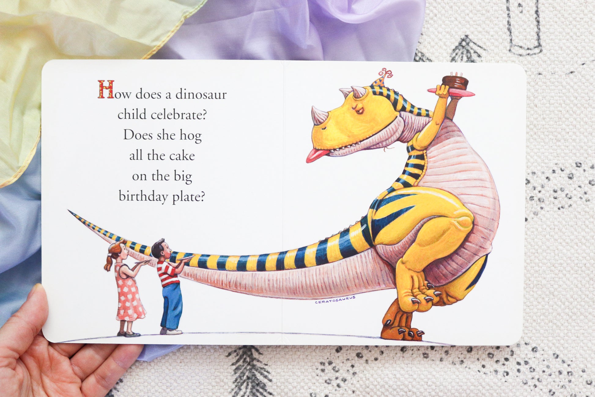 All little dinosaurs love to get presents, and this new board book will be an immediate favorite. From birthday hats to Ceratosaurus-sized cakes, America's young readers will laugh out loud as the celebration moves from "bad" birthday behavior to just the right amount of silliness and sharing. Bestselling duo Jane Yolen and Mark Teague have created the perfect introduction to birthday parties, with the same beloved humor and warmth of all their previous bestselling "How Do Dinosaurs" books.