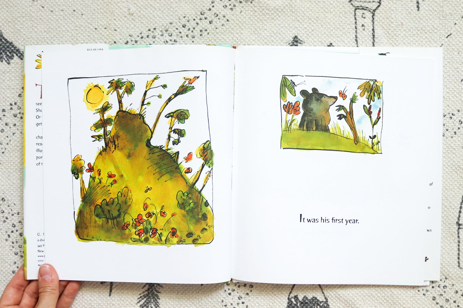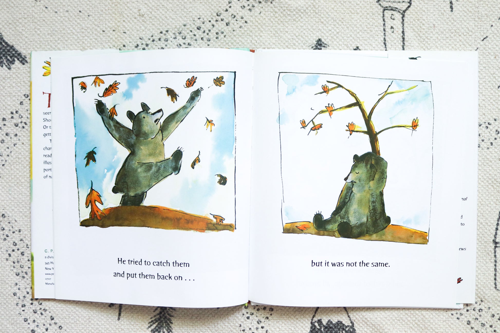 It's a young bear's first autumn, and the falling leaves surprise him. He tries to put them back on the trees, but it doesn't work. Eventually, he gets sleepy and burrows into the fallen leaves for a long nap. When he wakes up, it's spring, and there are suddenly brand-new leaves all around, welcoming him.