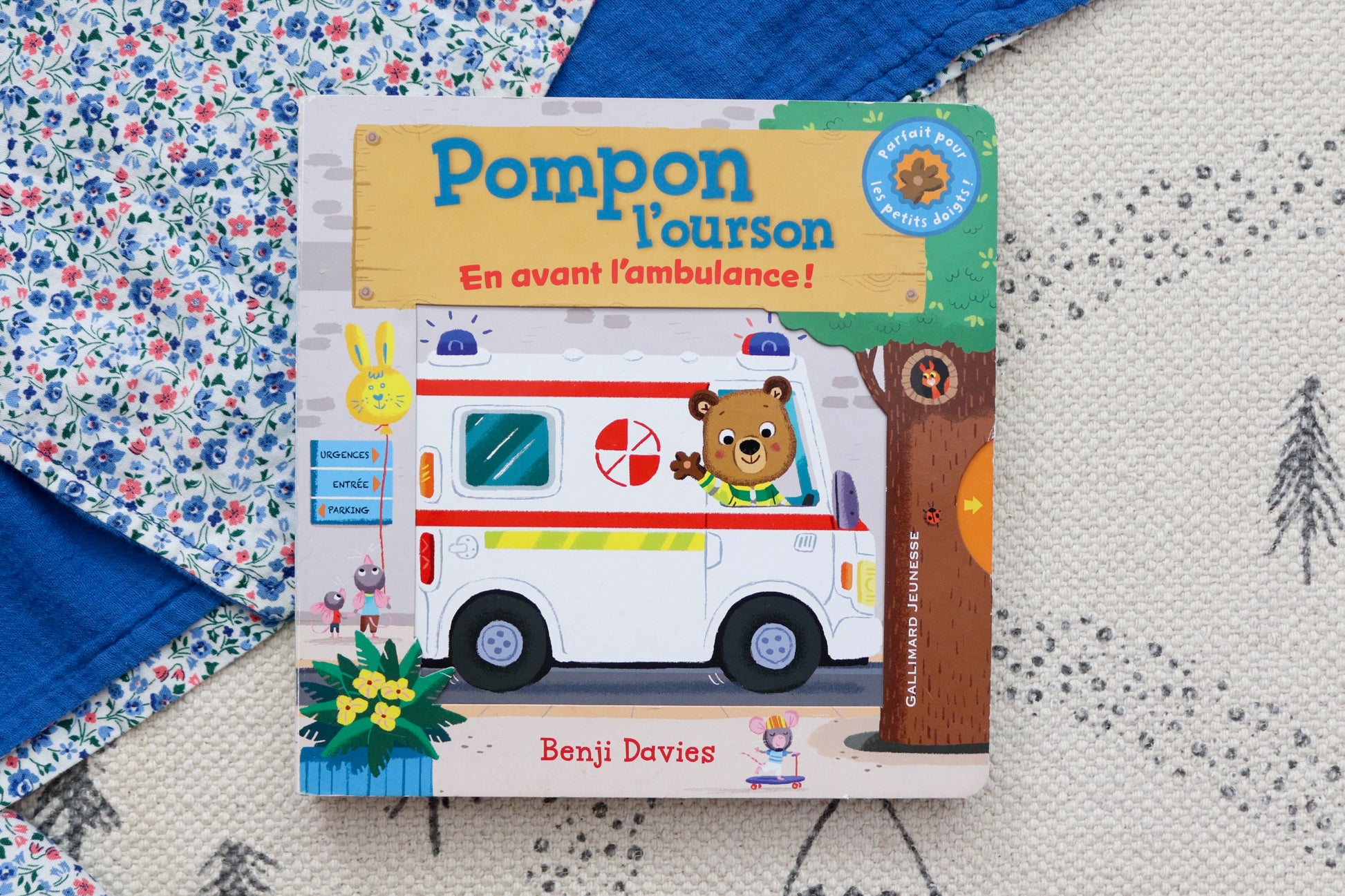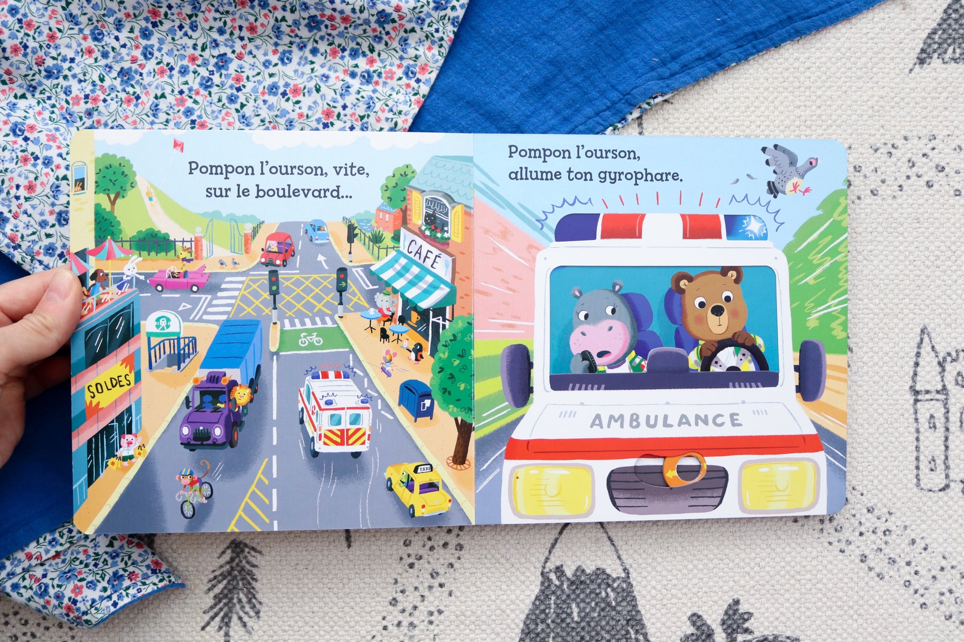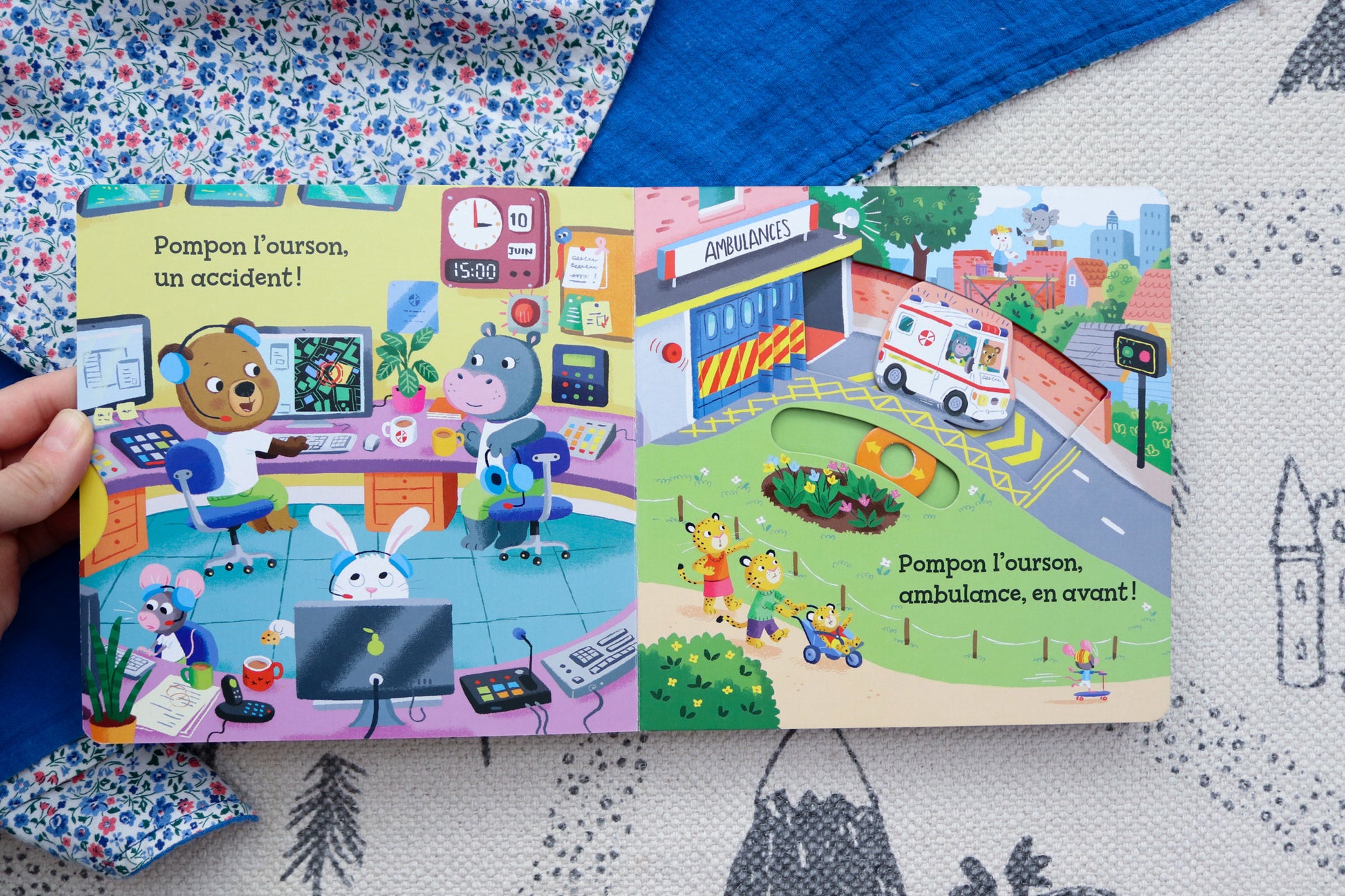 Pompon l'ambulancier à la rescousse ! Un livre très solide avec des tirettes à manipuler.
